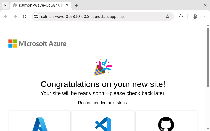 After the web app was created, I navigated to the rather ugly URL that came with it and landed on a default Azure page.