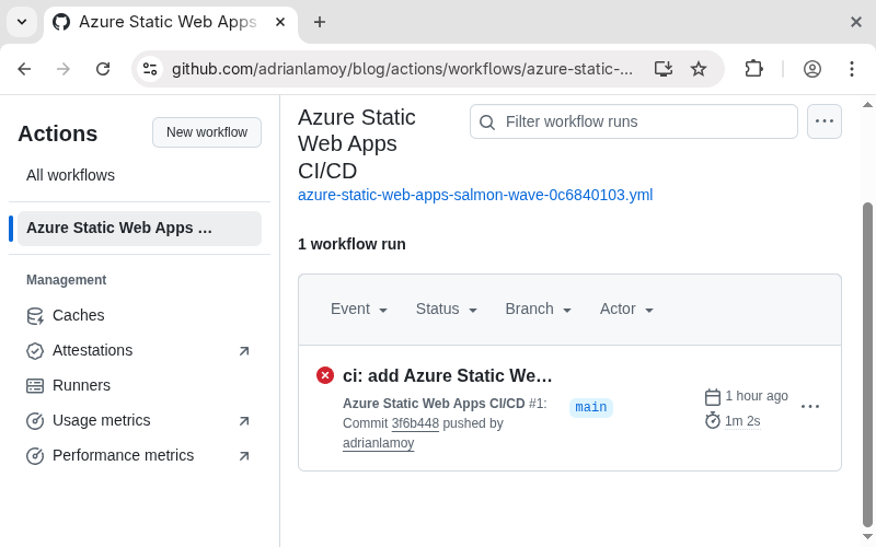 Back at the GitHub repo, I noticed that Azure has added new GitHub Actions workflow which failed to run. Time to get the workflow up, running and green.