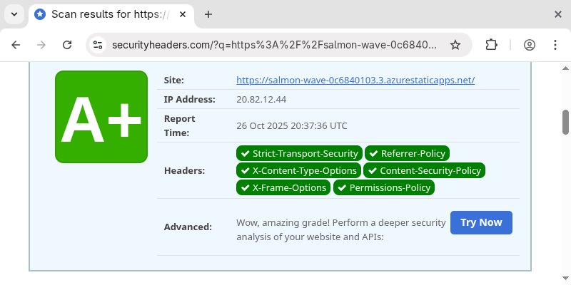 Then, it was time for a new scan of the security headers. I submitted the site again, and now it’s an A+.