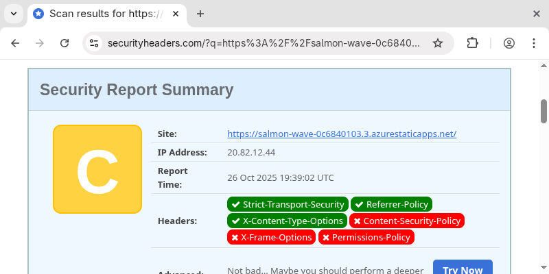 With a working site, it was time to run some scans. Since I’ve previously written about security headers, it would be bad not to practise it on my own blog. I ran a scan which resulted in a C. Room for improvement and more words in this post.