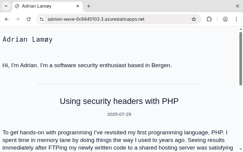 Now I have a working blog built with Zola, which is deployed on Azure with proper security headers. All without too much work.